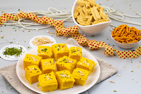stock photo of Diwali food or Diwali snacks or Diwali sweets like anarsa, bakarvadi, chakli, sev, bhujiya, shankar pale and chivda or chiwada, karanji, favourite indian diwali recipe, selective focus