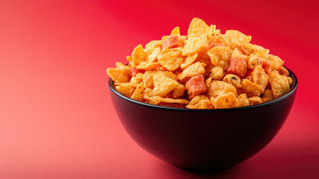 A vibrant bowl filled with assorted crunchy snacks against a bold red backdrop, perfect for parties, gatherings, or casual munching moments.