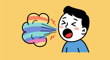 Cartoon man sneezing, with a rainbow-colored cloud emanating from his mouth. He has black hair, a white face, and a blue shirt.