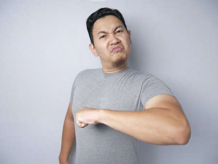 Photo image of funny Asian man showing cynical unhappy angry facial expression, pointing himself proudly