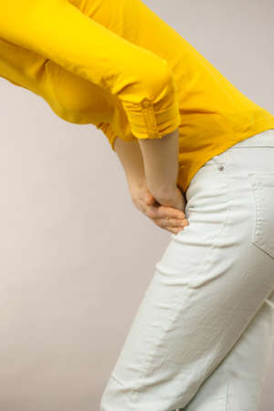 Closeup young sick woman with hands holding pressing her crotch lower abdomen. Medical or gynecological problems, healthcare concept