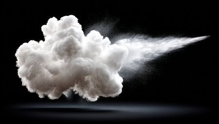 A fluffy, white cloud with a stream of vapor, against a stark, black background