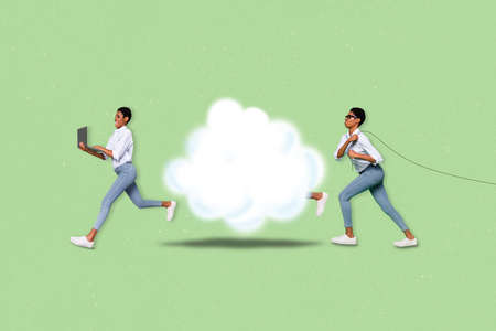 Creative collage of busy motivated person running pull difficult rope isolated on green color background