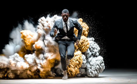 Stuntman sprinting away from a massive explosion, engulfed in flames and smoke, capturing the intensity of danger and adrenaline in a dark setting