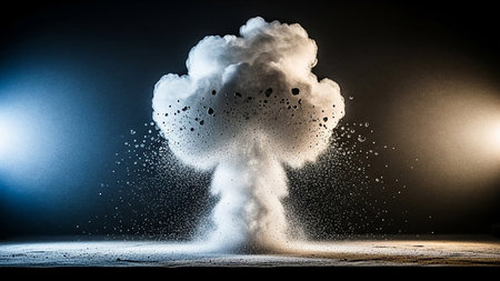 Explosion of white smoke on black background. Mixed media. Mixed media