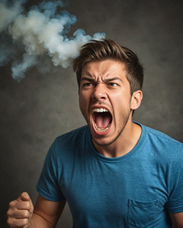 Angry young man, blowing steam coming out of ears, about to have nervous atomic breakdown. Negative human emotions, facial expressions, feelings, attitude