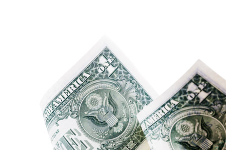 Two US dollars behind on a light background, close-up of a currency folded in a triangle