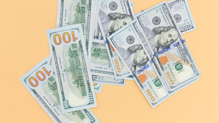 Overhead shot of a pile of one hundred dollar bills, symbolizing wealth and financial stability. Ideal for illustrating finance and investment concepts against a solid color background.
