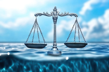 A balance scale is partially submerged in calm water with a blue sky and clouds in the background.