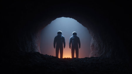 Two astronauts stand at the entrance of a dark cave, gazing toward a warm, glowing light in the distance, suggesting an intriguing exploration ahead.