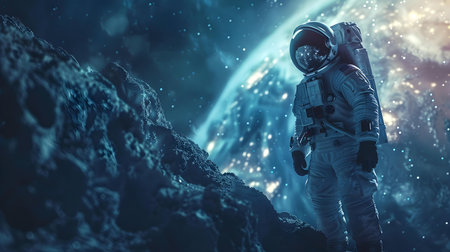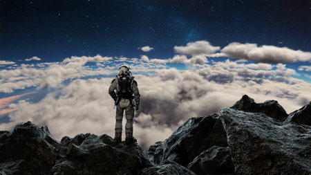 Astronaut stands on a rugged surface, gazing out across a vast cloud sea under a starry sky at twilight. The scene captures the blend of exploration and wonder in space. 3d render