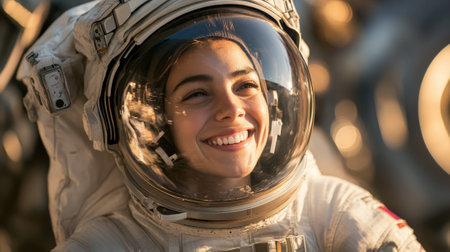 Smiling Female Astronaut Inside a Spacecraft Wearing a High-Tech Helmet . High quality photo