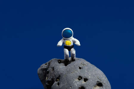 Cute miniature cosmonaut on a moon stone on a dark blue background. Minimal space day card.