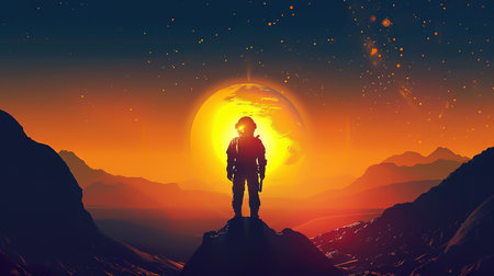 A stunning scene featuring an astronaut silhouette set against a vibrant cosmic sky, blending vivid colors with a tranquil landscape, evoking themes of exploration and imagination.