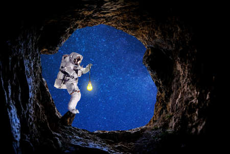 cosmonaut lighting witch light bulb route in outer space.space travel.