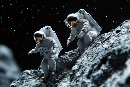 Space explorers navigate rocky asteroid terrain in the dark vastness of space, showcasing adventure, technology, and discovery.