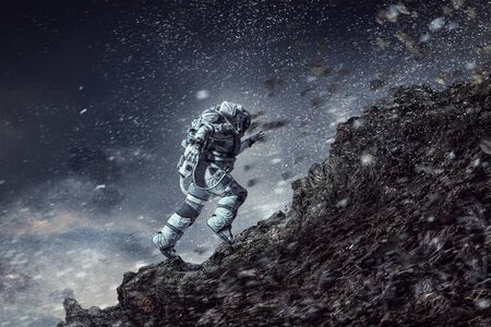 Satisfied Astronaut raising arms while standing on rocky mountain. Spaceman wearing white space suit and helmet. Concept of cosmonautics, space travel, freedom and winning.
