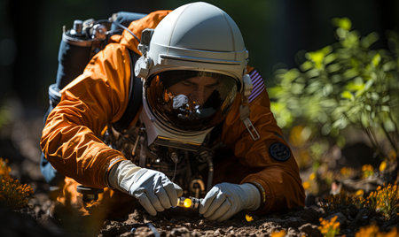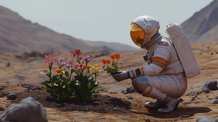 Astronaut kneeling on Mars, carefully planting flowers in a futuristic greenhouse, blending science and nature.