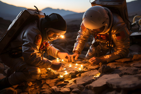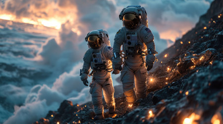 The side view of the couple astronaut human that has traveling to the various place on the land but yet it looks like human still trying to find something to be next target of the exploration. AIGX03.