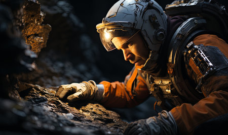 In the eerie silence of Mars, an astronaut examines rock formations, uncovering clues to the planet's habitable past.
