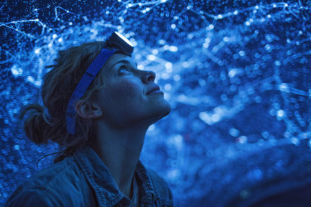 A woman is looking up at a stunningly detailed starry night sky filled with stars and constellations. She wears a headlamp, enhancing the experience of this outdoor adventure.