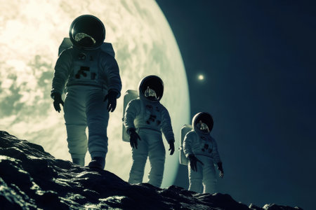 Three astronauts walk on the surface of a moon, illuminated by a large, bright planet in the background.