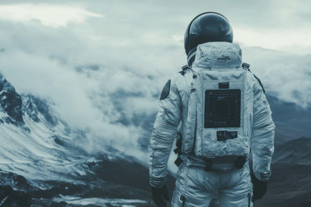An astronaut stands alone in a stunning mountainous area, surrounded by clouds and rugged terrain.