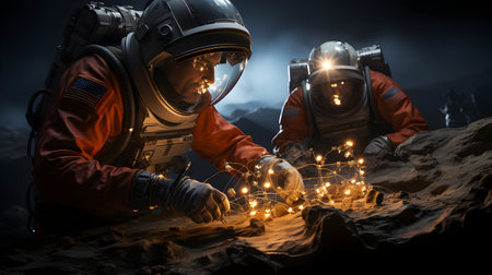 astronauts working diligently to repair and maintain the International Space Station (ISS). They are performing tasks outside the station,Generated with AI