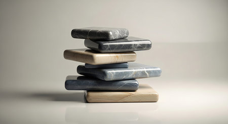 Stack of polished stone slabs with marble patterns arranged in balance Clear details and vibrant colors enhanc...