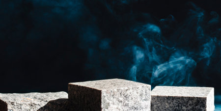 Stone pedestal with smoke on black background. Mockup for product display