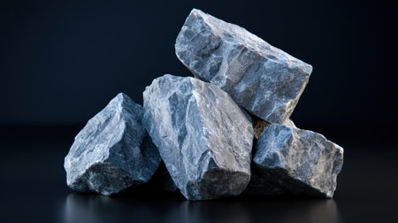 A collection of rough gray stones is arranged in a pile atop a sleek dark surface. The lighting highlights their texture and shape, creating a striking contrast.