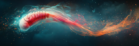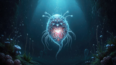 An illustration depicts a fantastical underwater creature, centrally positioned with a glowing core. The artwork utilizes vibrant blues, greens, and pinks against a dark backdrop. The composition suggests an underwater environment with various organic forms. Suitable for illustrating scientific, fantasy, or conceptual projects.