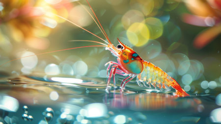 In a Tranquil Aquatic Scene, a Colorful Shrimp Glides Gracefully Through Vibrant Waters, Showcasing the Beauty of Nature. Generative AI