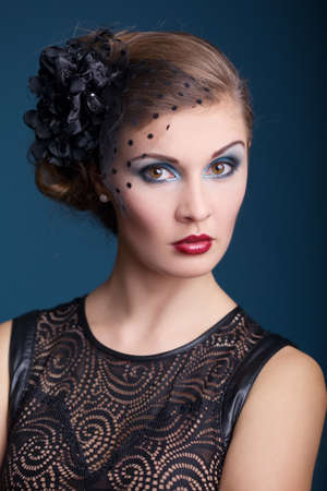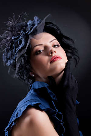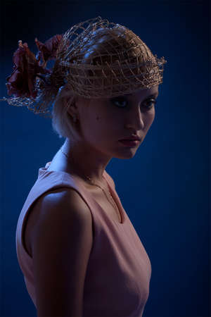 Portrait of beautiful retro-style woman in bonnet under blue lights