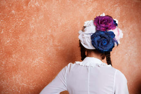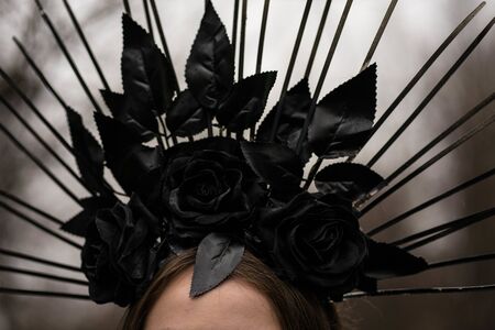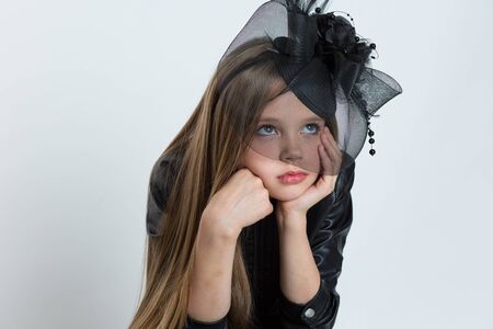 Kid fashion girl with fascinator posing pensive in studio at helloween. Closeup portrait of Caucasian kid model with floral headband isolated on white grey gray copy space background. Horizontal image