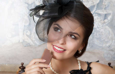 Portrait of beauty young woman with chocolate. Emulations of vintage style photography