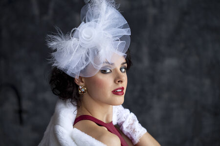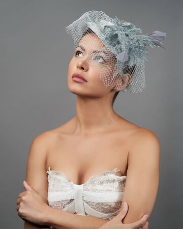 Elegant woman portrait in retro hat. Beautiful bride over grey background, close-up. Elegant brunette bride