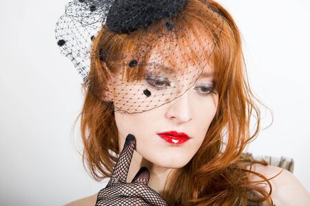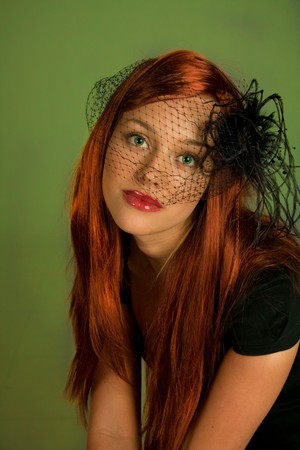 beautiful woman with red hairs, long eyelashes in black veil with copy space