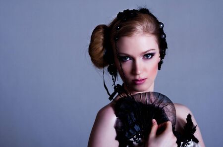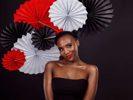 Conventional doesnt turn heads. Studio shot of a beautiful young woman posing with a origami fans against a black background.