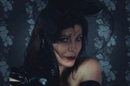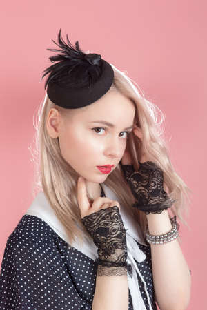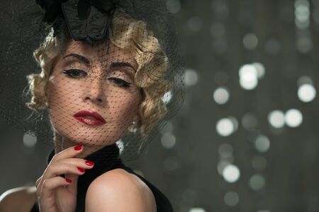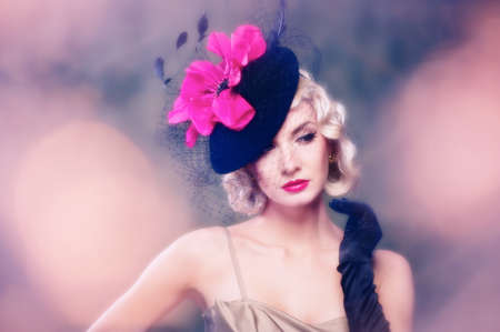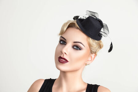 Elegant blond retro woman with red lipstick wearing little hat with veil