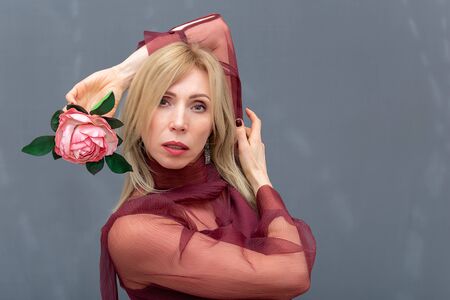Studio woman portrait on a gray background. Attractive blonde in a red dress holds a large pink flower in her hands. Copy space for your text or design.