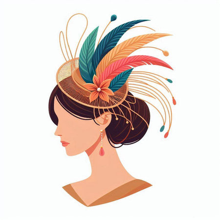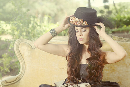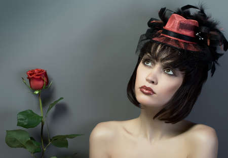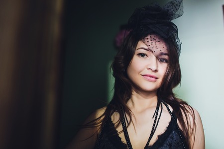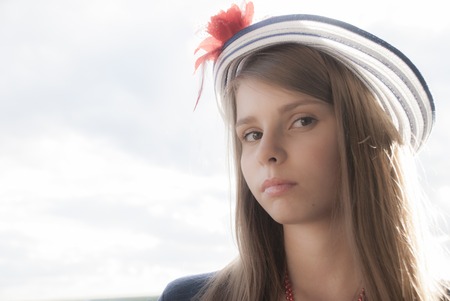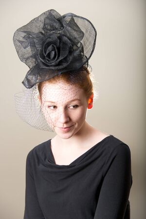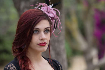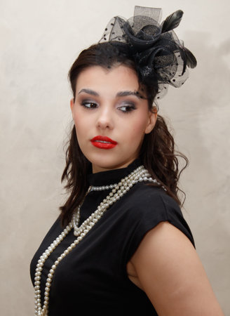 Attractive young woman, with a look from another era, holding on to her pretty feather hat.
