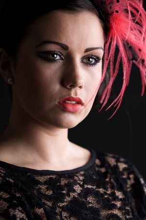 Attractive young woman wearing a black lace top and a black feather hairdressing. She is looking over her shoulder. Horizontal shot.