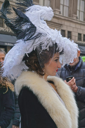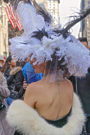 New York, New York: Woman wearing a black and white feathered hat and a fur-trimed stole at the Fifth Avenue Easter Parade.