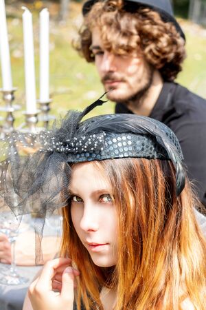 Couple man and woman in vintage steampunk dress very chic during the celebration of the harvest festival - outdoor picnic