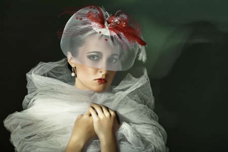 Retro portrait of a beautiful young girl wearing a hat with a veil on a white background