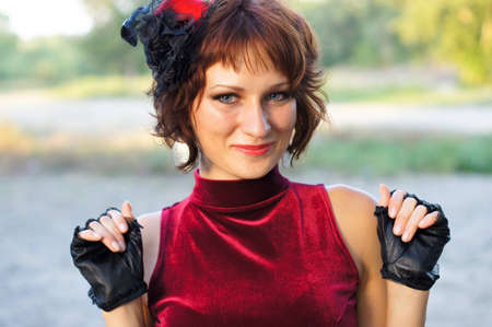 Sexy woman brunette long hair poses in red garrison cap with black veil on sunny day on light background