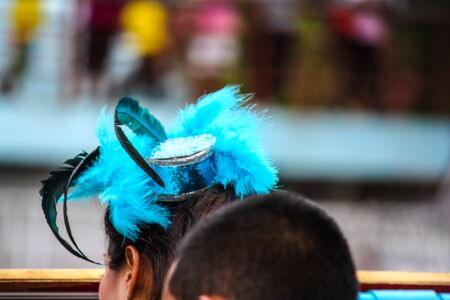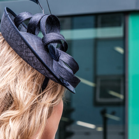 Epsom Surrey, London UK, June 04 2022, Rear Head Shot Of Young Woman Wearing Navy Blue Fascinator Hat