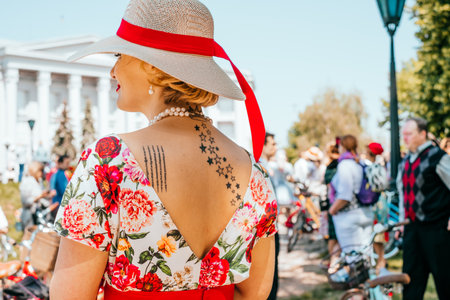 Kiev, Ukraine - May 12, 2018: Girl in floral print dress, straw hat and red lipstick participating in bicycle tweed run Retro cruise on May 12, 2018 in Kiev, Ukraine.