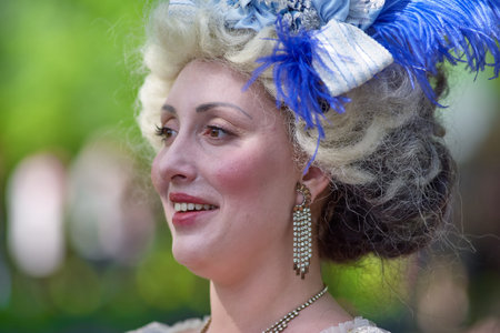 SAINT PETERSBURG, RUSSIA - MAY 19, 2019: The face of an unidentified girl in a medieval dress, a spring festival in St. Petersburg, Russia